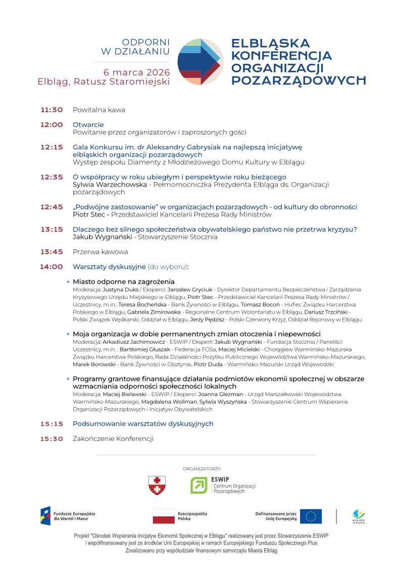 Celem Elbląskiej Konferencji Organizacji Pozarządowych jest zachęcenie do tworzenia sieci współpracy, która sprawi, że Elbląg stanie się miejscem bardziej odpornym na zmiany. Wspólna wymiana doświadczeń pozwoli na wypracowanie rozwiązań, które realnie przełożą się na jakość życia w naszym mieście.