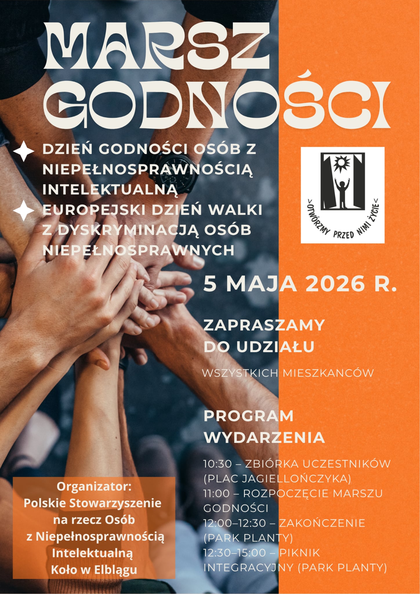 Wspieranie praw osób z niepełnosprawnością intelektualną to fundament otwartego i nowoczesnego społeczeństwa. Już 5 maja elbląskie ulice wypełnią się kolorem pomarańczowym, by przypomnieć o godności, równości i prawie każdego człowieka do pełnego uczestnictwa w życiu społecznym. Polskie Stowarzyszenie na rzecz Osób z Niepełnosprawnością Intelektualną (PSONI) Koło w Elblągu zaprasza wszystkich mieszkańców oraz przedstawicieli trzeciego sektora do udziału w wyjątkowym Marszu Godności.